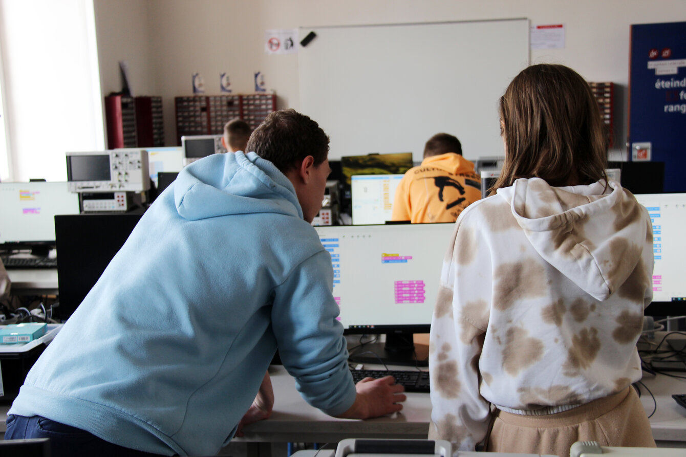 Les étudiants de première année de B.U.T. Génie Électrique et Informatique Industrielle de l'IUT et notre Fab Manager jouent le rôle d'animateurs auprès des élèves.