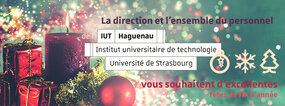 Fermeture de l'IUT 19 décembre 2025 12 janvier 2026 18h 8h Toute l’équipe de l’IUT vous adresse ses meilleurs vœux pour les fêtes de fin d’année L’IUT sera fermé du 19/12/2025 au 12/01/2026 au matin.